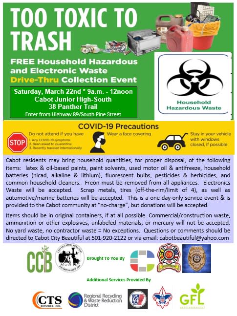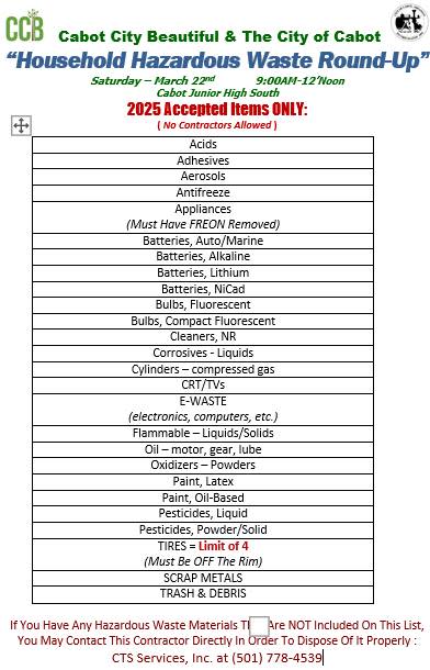 Join the City of Cabot and Cabot City Beautiful (CCB) for the Hazardous Waste Round-Up 2025 on Saturday, March 22nd, from 9 AM to 12 PM at Cabot Junior High South (38 Panther Trail). This drive-thru-only event is held in conjunction with the national Great American Clean-Up and Keep Arkansas Beautiful Month, providing a safe and convenient way to dispose of household hazardous waste and electronic waste (E-waste).