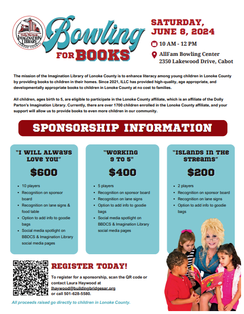 The Imagination Library of Lonoke County is excited to announce the first-ever 'Bowling for Books” fundraiser which will take place on Saturday, June 8, 2024, at Allfam Bowling Center in Cabot. ABOUT IMAGINATION LIBRARY OF LONOKE COUNTY The mission of the Imagination Library of Lonoke County (ILLC) is to enhance literacy among young children in Lonoke County by providing books to children in their homes each month at NO COST TO FAMILIES. Since 2021, Building Bridges Developmental and Community Services has been the administrator of the Imagination Library of Lonoke County, and has provided over 48,000 high-quality, age appropriate, and developmentally appropriate books to children in Lonoke County. The Imagination Library of Lonoke County is available to all children, ages birth to 5, and there are over 1,700 children enrolled in the Lonoke County affiliate at this time. The program is an affiliate of the Dolly Parton Imagination Library.Images