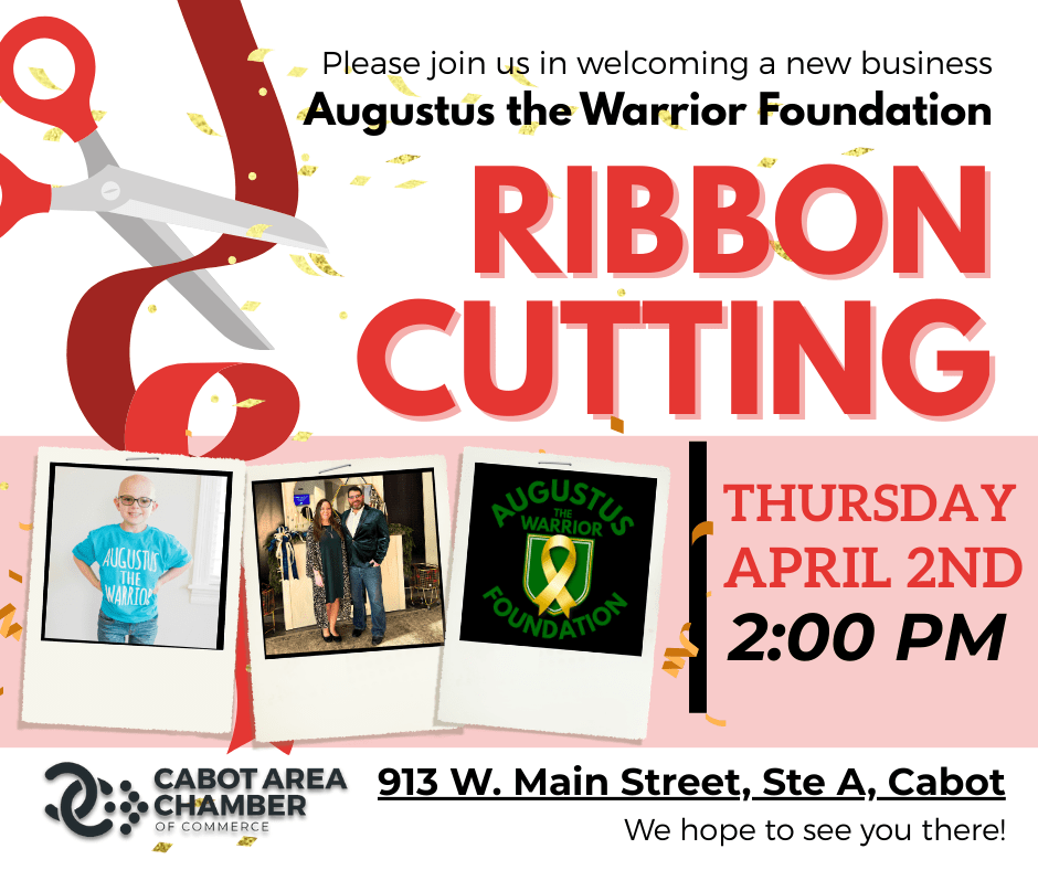 We’re thrilled to welcome Augustus the Warrior Foundation to the Cabot Area Chamber of Commerce and our community! Join us as we celebrate this new local business with a ribbon cutting on Thursday, April 2nd, at 2:00 PM at the Cabot Area Chamber of Commerce office located at 913 W. Main Street, Cabot, 72023.