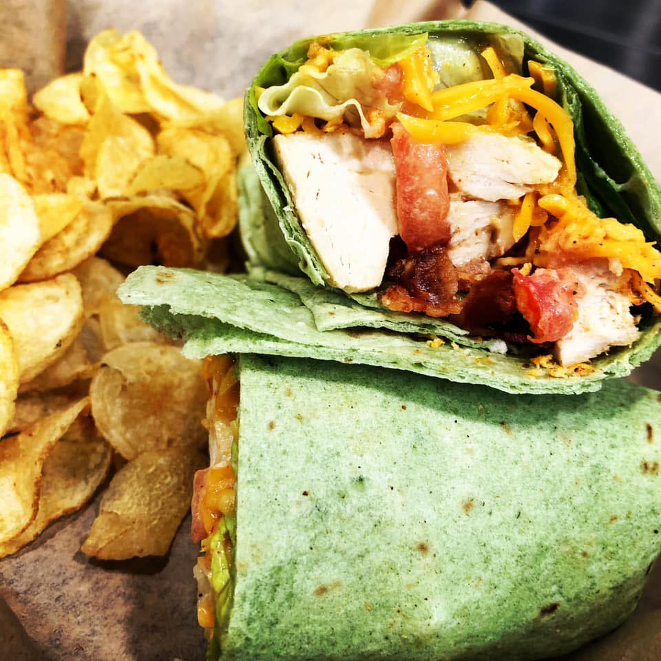 Chicken Bacon Ranch Wrap: Grilled chicken, crispy bacon, and ranch dressing wrapped in a soft tortilla.
